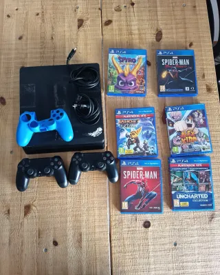 Console PlayStation 4 da 1TB in colore nero, insieme a due controller (uno nero e uno blu) e sette videogiochi. Giochi inclusi: Ratchet & Clank, Spider-Man, Spider-Man Miles Morales, Minecraft, Alex Kidd in Miracle World, Spyro Reignited Trilogy, Uncharted: The Nathan Drake. Include cavo di alimentazione.