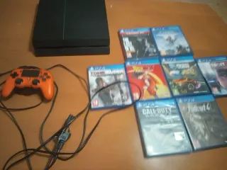 Console PlayStation 4 in colore nero, completa di controller e 8 giochi. - Console PlayStation 4 - Controller arancione - Tomb Raider - Dragon Ball Z Kakarot - rocket league - The Last of Us - Call of Duty Ghosts - fallout 4 - Detroit become human - Horizon Zero Dawn