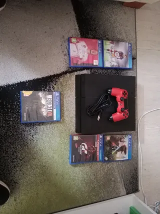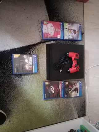 Console PlayStation 4 Slim da 500GB in colore nero, pronta per l'uso. Include un controller e cinque videogiochi. È in perfette condizioni. Controller DualShock 4 incluso. Giochi: Resident Evil VII, Days Gone, FIFA 21, The Last of Us Remastered, Red Dead Redemption 2. Non ho la scatola. Non accetto scambi.