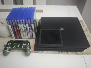 Console PlayStation 4 Pro in colore nero, insieme a un controller e molti giochi. - Controller con design mimetico. - Include i seguenti giochi: - FC 25 - F1 2024 - FC 24 - F1 2023 - FIFA 22 - Spider Man - Gran Turismo Sport - WRC 5 - Marvel Lego - The Crew 2