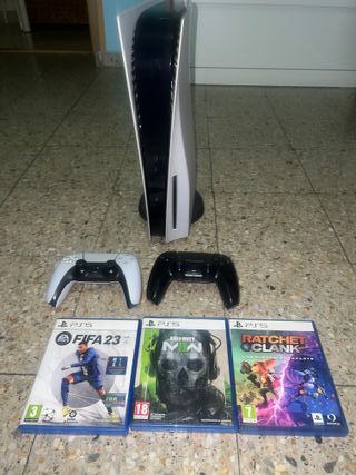 In vendita pack di console PlayStation 5 con due controller e tre videogiochi. Acquistato 1 anno fa, in perfette condizioni, SENZA SCATOLA E FATTURA. - Console PlayStation 5. - Controller DualSense bianco. - Controller DualSense nero. - Videogioco FIFA 23. - Videogioco Call of Duty: Modern Warfare II. - Videogioco Ratchet & Clank: Una Dimensione a parte. ⚠️: Il controller bianco ha un piccolo segno di bruciatura su un lato, non influisce sull'uso poiché tutti i pulsanti funzionano, se non lo si desidera, negozieremo il prezzo.