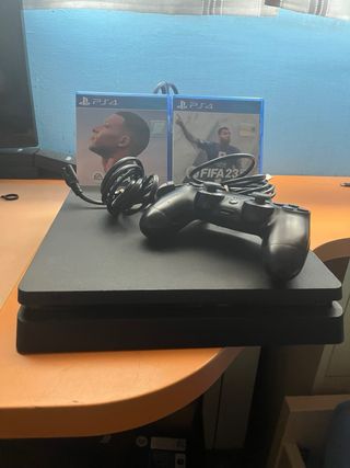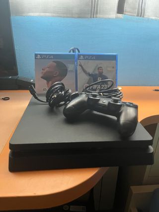Console PlayStation 4 Slim da 500GB in colore nero, insieme al videogioco FIFA 23. La vendo perché ho comprato la PS5 ma è in perfette condizioni. Include il controller DualShock 4. Cablaggio essenziale per il suo funzionamento.