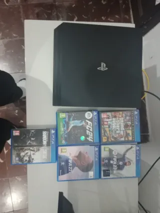 Vendo console PlayStation 4 Pro in colore nero, insieme a cinque videogiochi. Giochi inclusi: Rainbow Six Siege, FC 24, Grand Theft Auto V, FIFA 22, FIFA 23. Include cavi completi e un caricatore di comandi. Include 1 controller analogico. Vendita anche separata. Prezzo negoziabile.
