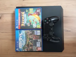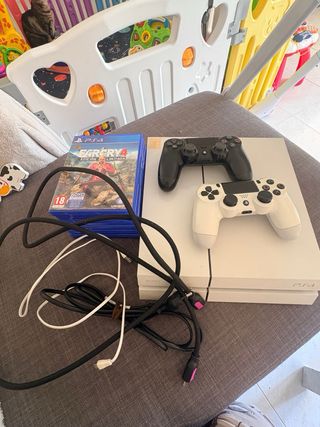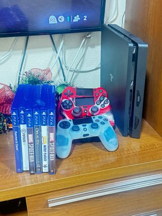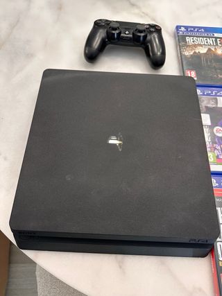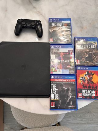 Console PlayStation 4 Slim da 500GB in colore nero, pronta per l'uso. Include un controller e cinque videogiochi. È in perfette condizioni. Controller DualShock 4 incluso. Giochi: Resident Evil VII, Days Gone, FIFA 21, The Last of Us Remastered, Red Dead Redemption 2. Non ho la scatola. Non accetto scambi.