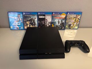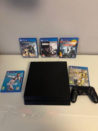 Console PlayStation 4 in colore nero, con controller ufficiale e cinque videogiochi. Giochi inclusi: FIFA 19, Titanfall 2, Rainbow Six Siege, The Division, FIFA 17. Controller ufficiale DualShock 4.