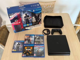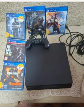 Console PlayStation 4 in colore nero, pronta per l'uso. Include: controller, 5 giochi (Uncharted 4, Jurassic World Evolution, Battlefield 1, The Last of Us Remastered e Call of Duty: Black Ops 4) e i cavi necessari.