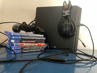 Consola PlayStation 4 Slim in colore nero, insieme a un pack di cinque videogiochi e delle cuffie. La pasta termica è stata cambiata qualche settimana fa. Giochi inclusi: Uncharted: The Nathan Drake Collection, The Witcher 3: Wild Hunt + Dark Souls III, Death Stranding, Red Dead Redemption, Uncharted 4: Il Destino del Ladro, Uncharted: Il Tradimento Perduto. Cuffie Genbu nere.