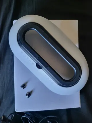 Base di ricarica per PlayStation VR2. Include anche un adattatore per gli occhiali compatibile con PC. Design ovale in bianco e nero. Include due piccoli adattatori. Connessioni e certificazioni visibili sulla base.