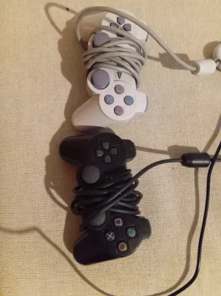 Due controller per console, uno per PlayStation 1 e uno per PlayStation 2. Entrambi sono della marca Sony. - Controller bianco per PS1. - Controller nero per PS2.