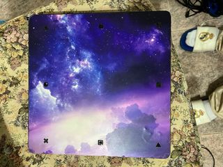 Console PlayStation 4 Slim con un design unico di galassia in toni viola e bianchi. Include due controller. Il lettore CD non funziona. Design galattico. Include due controller DualShock 4. Modello PS4 Slim.
