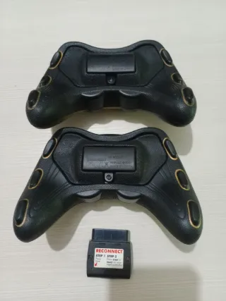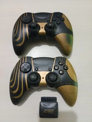 Coppia di controller per PlayStation 2 Konami, edizione speciale Pro Evolution Soccer. - 2 controller wireless. - 1 ricevitore. - Controller in gomma morbida e design unico con finiture dorate e nere.