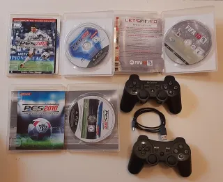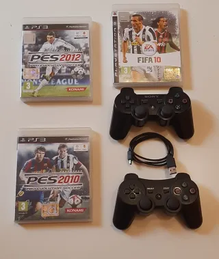 Set composto da 1 joystick controller ps3 originale sony, 1 joystck controller compatibile ps3, 1 cavo di ricarica, fifa10 originale, pes2010 originale, pes2012 originale. Tutto tenuto in condizioni perfette.
