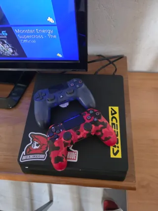 Consola PlayStation 4 Slim da 1TB in colore nero, con due controller DualShock 4 e vari videogiochi. Dettagli: - Consola PlayStation 4 Slim - Capacità di 1TB - Due controller DualShock 4 - Giochi inclusi: FIFA 23, FIFA 21, FIFA 20, FIFA 18, FIFA 17, FIFA 22, Battlefield 1, Mafia, Dirt 2.0, Cars