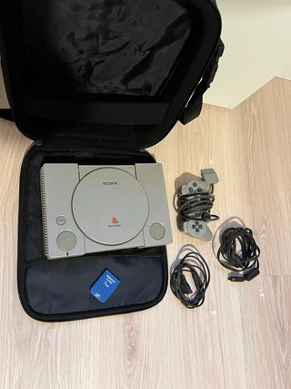 Consola classica Playstation 1 nel suo iconico colore grigio. Include il controller originale (difetto in uno dei joystick), cavi di connessione, custodia di trasporto, gioco Spyro 2 e memory card.