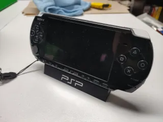 Console portatile Sony PSP 3004 in colore nero. Include supporto e caricabatterie. La batteria non è inclusa. Modello PSP 3004. Colore nero e bianco.