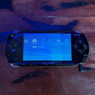 Console portatile Sony PSP in colore nero. Include custodia protettiva. - Custodia da trasporto imbottita. - Cinturino di fissaggio con chiusura a clip. - Include caricatore e fotocamera per la PSP. - Lo schermo della PSP ha una striscia nera che deve essere riparata e deve essere collegato alla batteria.