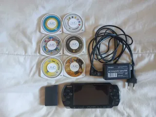 Console portatile Sony PSP 3004 in colore nero. Include 7 UMD di giochi, il caricatore, la batteria non funziona, è deteriorata dal tempo. - 7 giochi inclusi - Caricatore AC adattatore per PSP.