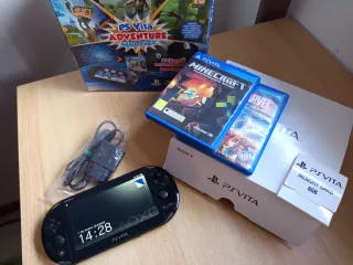 Console portatile Sony PS Vita in colore nero. Include giochi e accessori per iniziare a divertirsi. - Console PS Vita - Gioco FIFA 15 Legacy Edition - Gioco Minecraft PlayStation Vita Edition - Caricatore - Scatola originale dei giochi
