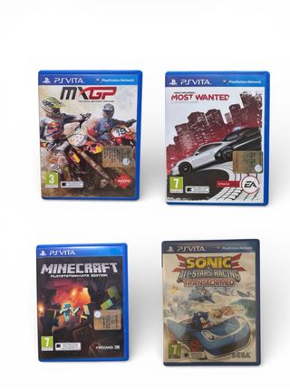 Lotto composto da 4 videogiochi per PS Vita. - MXGP: The Official Motocross Videogame - Need for Speed: Most Wanted - Minecraft: PlayStation Vita Edition - Sonic & All-Stars Racing Transformed