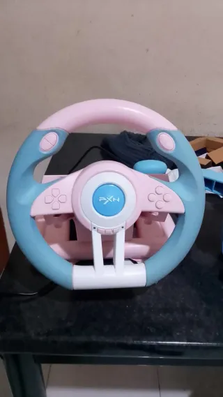 Volante da gioco PXN V3, compatibile con PlayStation. - Design colorato con finiture rosa e azzurre. - Pulsanti e levette integrati per un controllo completo. - Logo PXN al centro del volante. Compreso di pedali