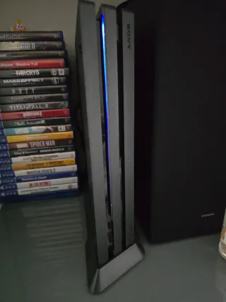 Console PlayStation 4 Pro in colore nero, completa di cavi e controller. + stunt che tiene la console + cavo di alimentazione + 21 giochi. Giochi e console tenute come nuovi. Prezzo non trattabile. Console 220 Giochi 180 Tutto 350