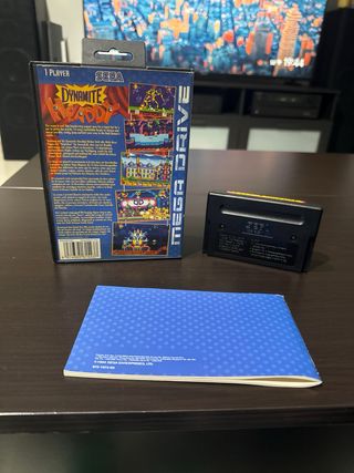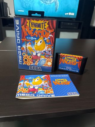 Gioco per Mega Drive Dynamite Headdy. Include scatola, cartuccia e manuale di istruzioni. Scatola originale con arte accattivante. Cartuccia di gioco. Manuale di istruzioni con dettagli del gioco.