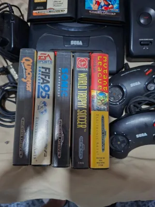 Console Sega Mega Drive II con due controller + 7 giochi + Sega Master System II. Giochi: Quackshot, FIFA 95, Sonic The Hedgehog, World Trophy Soccer, Mutant League Football, Street Fighter II Special Champion, World Cup USA 94.