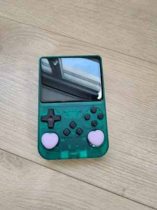 Console di videogiochi portatile di colore verde traslucido. Design compatto ed ergonomico. Pulsanti di controllo di colore nero. Joystick con protezioni a forma di cuore color lilla.