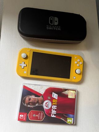 Console Nintendo Switch Lite in colore giallo, include il videogioco FIFA 18 e una custodia originale. - Custodia protettiva per la console. - Videogioco FIFA 18 per Nintendo Switch.