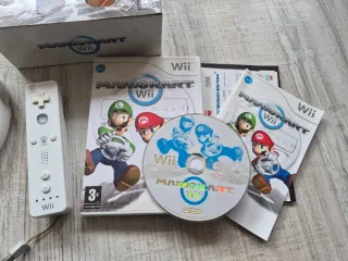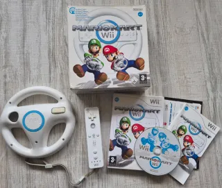 Console Nintendo Wii in bianco. Include la console e supporto, 2 telecomandi Wii Remote e 1 Nunchuk, gioco Mario Kart Wii, gioco Wii Sports, volante per Mario Kart, cavi di connessione, barra sensore dei comandi e adattatore di corrente.