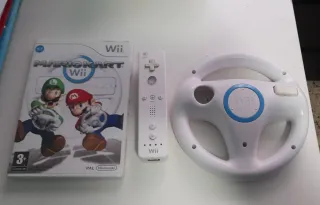 Pacchetto di Mario Kart Wii che include il gioco, il volante e il controller Wii. - Gioco di corse. - Volante bianco con dettagli blu. - Controller Wii bianco.