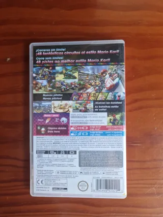 Gioco di corse per Nintendo Switch. Copertina con design vivace e personaggi iconici. Classificazione PEGI 3. Testi in spagnolo e portoghese.