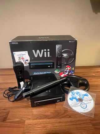 Console Nintendo Wii nera, edizione speciale Mario Kart. - Console Wii nera - Volante Wii - Gioco Mario Kart Wii - Controller Wii Remote e Nunchuk