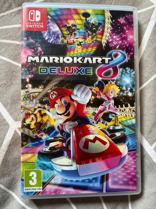 Gioco di corse Mario Kart 8 Deluxe per Nintendo Switch. Copertina con design colorato e personaggi iconici. Classificazione per età: 3 anni.