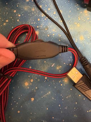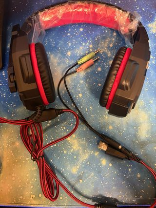Cuffie da gaming con dettagli rossi e illuminazione LED. - Design confortevole per lunghe sessioni di gioco. - Cavo intrecciato resistente. - Connettori audio e USB.