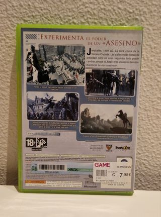 Videogioco Assassins Creed per Xbox 360, copertina posteriore in inglese ma giocabile perfettamente in spagnolo.