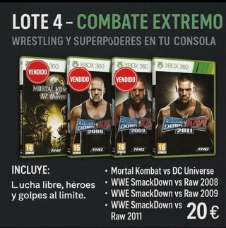 LOTE 1 – COLLEZIONE PES PES 2008, PES 2009, PES 2010, PES 2011, PES 2012, PES 2013 LOTE 2 – FIFA FIFA 14, FIFA 15 Ultimate Team Edition LOTE 3 – AZIONE TOTALE Gears of War, Battlefield 3 (Ed. Limitata), Battlefield 4, Max Payne 3, Splinter Cell: Blacklist, Resident Evil 5, Bioshock LOTE 4 – COMBATTimento EXTREMO Mortal Kombat vs DC Universe, SmackDown vs Raw 2008, 2009 e 2011 LOTE 5 – MONDI EPICI Blue Dragón, Dragón Ball Z Burst Limit, Saints Row IV (SIGILLATO), Thor Dio del Tuono, Assassin’s Creed III Edizione Speciale, Harry Potter e "le Reliquie della Morte" Parte 1 LOTE 6 – VELOCITÀ PURA Forza