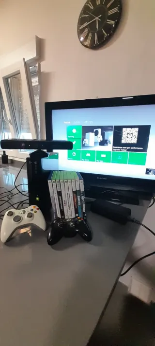 Consola Xbox 360 Elite in buone condizioni, con un disco rigido da 120GB. La console include: - Cavi originali video, alimentazione e controller (connessione video Euroconector) - Kinect con scatola, manuali e cavi originali - Manuali - 2 controller (il bianco è più usurato sui joystick, ma funzionano bene e sono puliti) - 2 cover per batterie + 1 batteria ricaricabile con cavo - 9 giochi (quelli per Kinect sono opzionali, ma abbiamo anche classici come GTA V, Minecraft, The Orange Box e Forza Motorsport 5) La console è intatta, formattata e funziona perfettamente. 🔴 Prezzo non negoziabile ;)