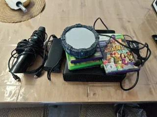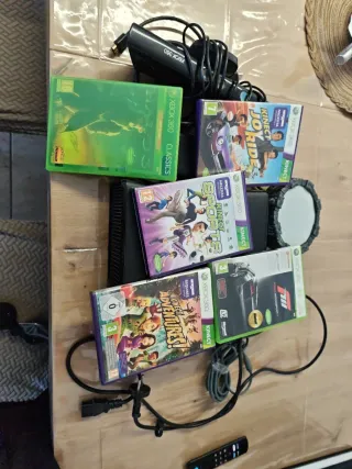 Consola Xbox 360 in bianco, ideale per goderti i tuoi giochi preferiti. Include: controller e cavo, cablaggio e alimentatore, due hard disk esterni, scheda di memoria da 512 MB, telecomando, 4 giochi, adattatore wifi. Il lettore CD può bloccarsi, c'è un modo per risolverlo ma non lo usiamo e non abbiamo voluto fermarci a farlo.