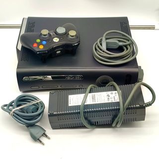 Console Xbox 360 in colore nero, pronta per giocare. Include i seguenti giochi: Forza Motorsport 3, Gears of War 3, Mass Effect, controller wireless argentato, alimentatore, cavo video.