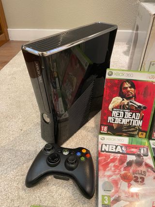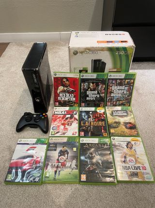 Console Xbox 360 in colore nero con hard disk da 250GB e dieci videogiochi. - Red Dead Redemption - Grand Theft Auto IV: Episodes from Liberty City - Grand Theft Auto V - NBA 2K11 - L.A. Noire - WRC: FIA World Rally Championship - Forza Motorsport 4 - FIFA 15 Legends - Arcania: Gothic IV - NBA Live 10 Include alimentatore, controller e cavo AV di Xbox.