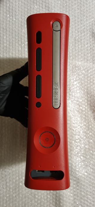 Console Microsoft Xbox 360 edizione limitata a tema Resident Evil 5 con controller, alimentatore, istruzioni e cavo rca. La console è stata aperta per sostituire la cinghia del lettore dischi, che si bloccava e adesso funziona correttamente, mentre il controller funziona ma il tasto xbox lampeggia continuamente, indicando che le batterie sono scariche ed è stato successivamente aperto per cercare di risolvere il problema, ma senza trovare una soluzione. Lo sportellino dell'entrata USB è rotto.
