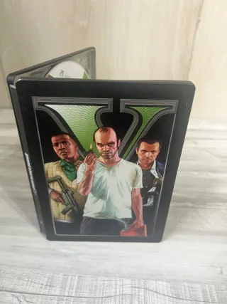 Edizione da collezione in Steelbook del videogioco Grand Theft Auto V per Xbox 360 funzionante. Include due dischi, custodia metallica. Ideale per collezionisti o decorazione gaming. Buono stato.