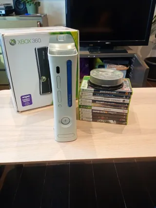 Consola Xbox 360 in bianco, pronta per ore di intrattenimento. Include 32 videogiochi. La console non ha il cablaggio, quindi non ho potuto verificare che funzioni. L'aspetto fisico è buono. Viene con la scatola. Giochi come Skyrim, Fallout, Diablo, GTA, Star Wars, Bayonetta, Dragon Ball.