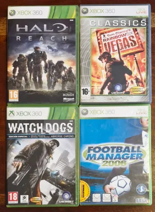 Lote di 4 videogiochi per Xbox 360. PAL Spagna. Giochi in ottime condizioni e con i loro manuali in spagnolo tranne Watch Dogs. - Halo Reach - Tom Clancy's Rainbow Six Vegas (Classics) - Watch Dogs (Edizione Speciale) - Football Manager 2006 Spedizioni tramite wallapop.