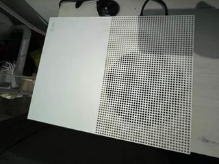 Console Xbox One S in bianco. In buone condizioni generali, funziona perfettamente. Include 2 controller, il bianco originale senza fili e il nero non originale con cavo.