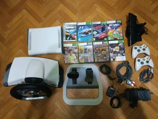 Consola Xbox 360 in bianco, con volante e pedali per un'esperienza di gioco immersiva. Include due controller e otto videogiochi. - Volante e pedali - Due controller wireless. - Otto giochi: F1 2012, Cars, Just Dance 3, Top Spin 3, Just Dance 4, Carnival Games, Naruto Shippuden Ultimate Ninja Storm 2, Kinect Sports. Tutti i cavi: Console alimentazione e TV, cavi Kinect, cavo per caricare i controller, cavi per il volante. Nella foto si vede che una parte della console è rotta ma non influisce sul funzionamento, è solo estetico. Tutto in perfetto stato per l'uso. In offerta fino al 30 gennaio.