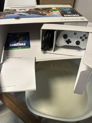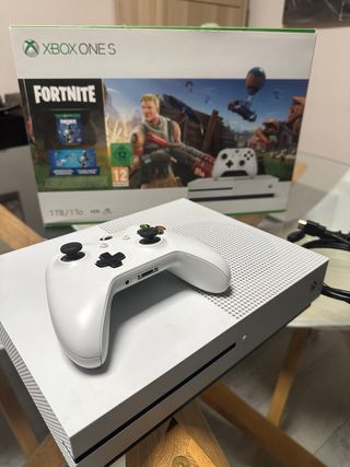 Consola Xbox One S con disco rigido da 1TB in configurazione originale. NON INCLUDE LA SKIN DI FORTNITE! PREZZO NON TRATTABILE. Include controller bianco trasparente, cavo HDMI incluso, cavo per controller incluso.