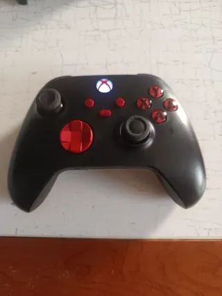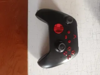 Controller Xbox in colore nero con dettagli in rosso. Funziona perfettamente. È stato dotato di un nuovo joystick a causa di un problema di drift. - Design ergonomico. - Pulsanti frontali e direzionali con finitura rossa brillante. - Stick analogici neri. - Venduto senza cavo.