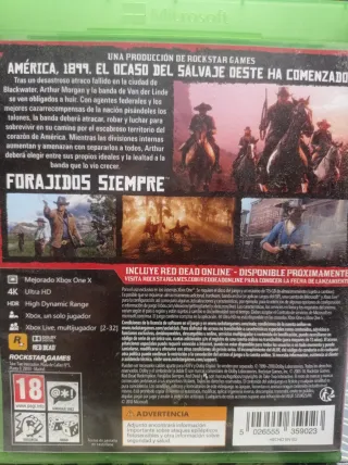 Vendo Red Dead Redemption 2 per Xbox One (funziona anche su Xbox Series X). Il disco è in ottime condizioni e funziona perfettamente. Include la confezione originale. Storia in spagnolo, modalità storia e online disponibili. Gioco eccezionale con mondo aperto e grafica impressionante. Contiene disco 1 per l'installazione e disco 2 per iniziare a giocare.